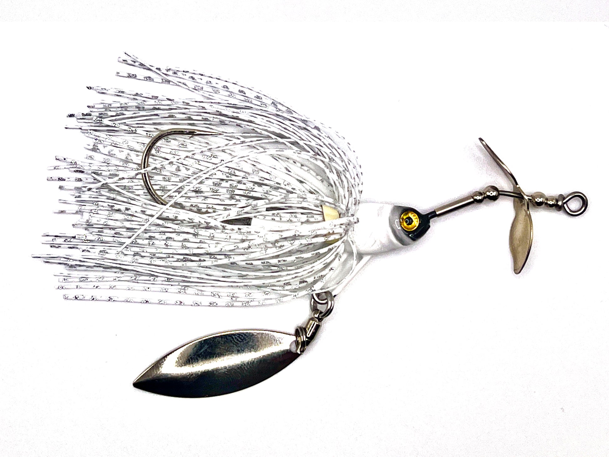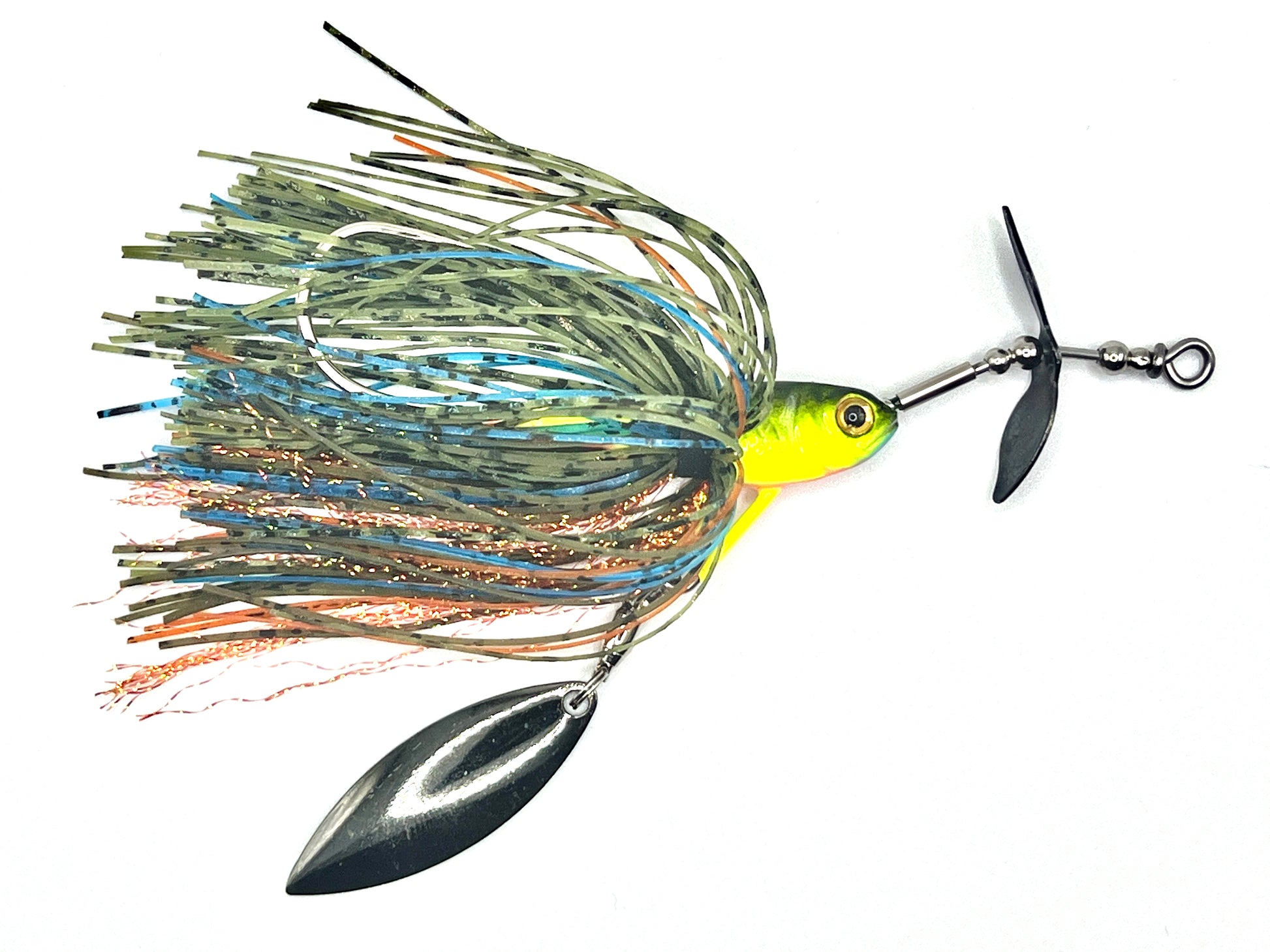 The D&M Custom Baits Chopper Swim Jig features a unique design complete with a propeller in front of the head that churns up the water and also helps keep the bait from rolling at high retrieve speeds. It also comes equipped with a small willow blade extending from the bottom of the head, which adds another element of flash as it moves through the water. The detailed head design, complete with scales, gill plates and 3D eyes, adds to the lifelike presentation as well, along with its premium silicone skirt.